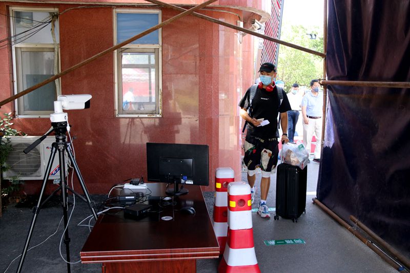 报到现场秩序井然,所有工作人员和返校学生全部佩戴口罩,间隔1米以上。学生在候检区依次排队进行体温检测、核查身份、消毒杀菌、出示健康码及核酸检测证明,领取入门通行证和在校封闭期间的注意事项等材料。通过人脸识别测温管控系统检查进入学校后,到招生就业处大厅进行现场核酸检测。然后,由教师代表组成的志愿者帮助学生将行李运送至宿舍区。