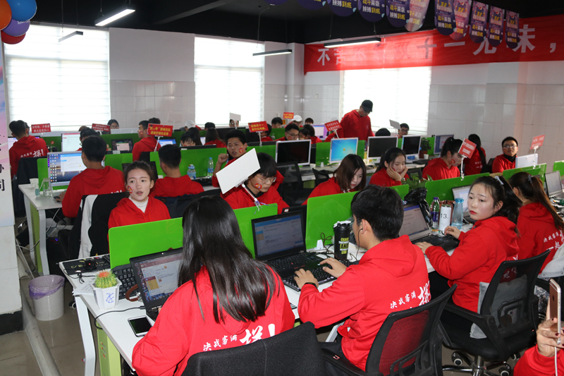 10日下午3点,我院综合实训楼5楼校企合作电商孵化基地热闹非凡,学院校企合作电商孵化项目2018年度“双11”启动大会在这里拉开战幕,学院党委委员、副院长王立厚亲临现场致辞、为同学加油鼓劲;校企合作公司负责人李霞女士发表热情洋溢的讲话;系主任授予战旗;街舞助兴,团队亮相,校企击鼓,键盘敲击声……现场260名客服将为6个亿销售额的目标奋力冲刺。