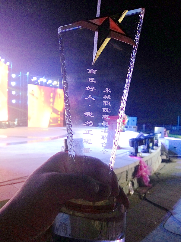 6月22日晚,由商丘市委宣传部、市文明办、商丘军分区政治部、市总工会、团市委、市妇联联合主办,商丘广播电视台、商务中心区管委会协办的“商丘好人•我为正能量代言”高校巡礼活动在日月湖畔举行,来自全市各本、专科院校的14位正能量代言人和两个集体获得首届商丘市高校“商丘好人”荣誉称号。市领导王全周、刘沛、岳爱云、王清辰,商丘军分区副司令员夏宗长,市城乡一体化示范区管委会主任陈向阳等出席活动并为获奖者颁奖。我院荣获两项“商丘好人”荣誉称号,分别是敬业奉献模范科研处处长陈琼、乐于助人模范永城职业学院志愿者联合会。