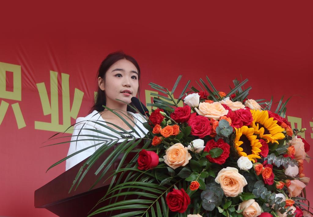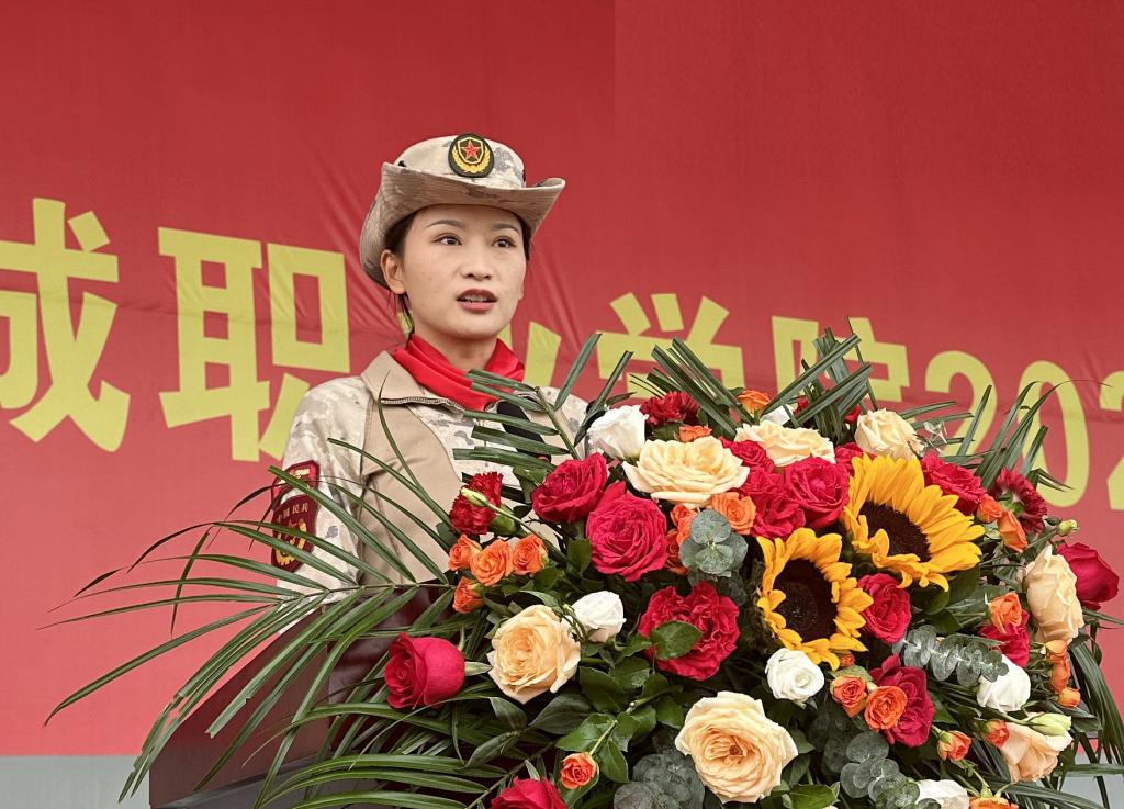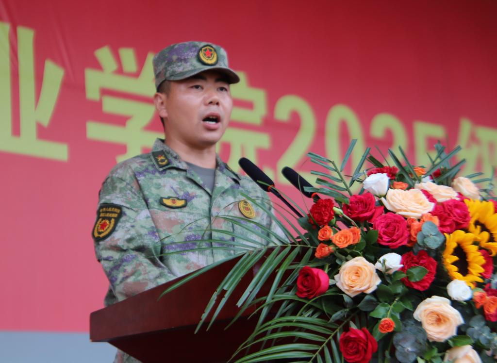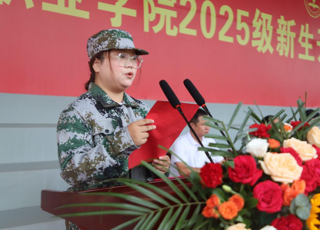 优秀校友代表、纪念中国人民抗日战争暨世界反法西斯战争胜利80周年阅兵式受阅民兵李嘉欣分享了参加阅兵的经历以及毕业后在岗位上挺膺奋进的成长经历,鼓励学弟学妹们珍惜校园时光,以实干成就梦想;2024级学生代表、机电工程系白雨歌以“学习‘婵宝’精神”为例,讲述了在永职的成长感悟,为新生树立了榜样;2025级新生代表、经济贸易系杨慧斐则表达了对军训的期待以及对大学生活的憧憬与规划,展现了新一代永职学子的朝气与决心。
