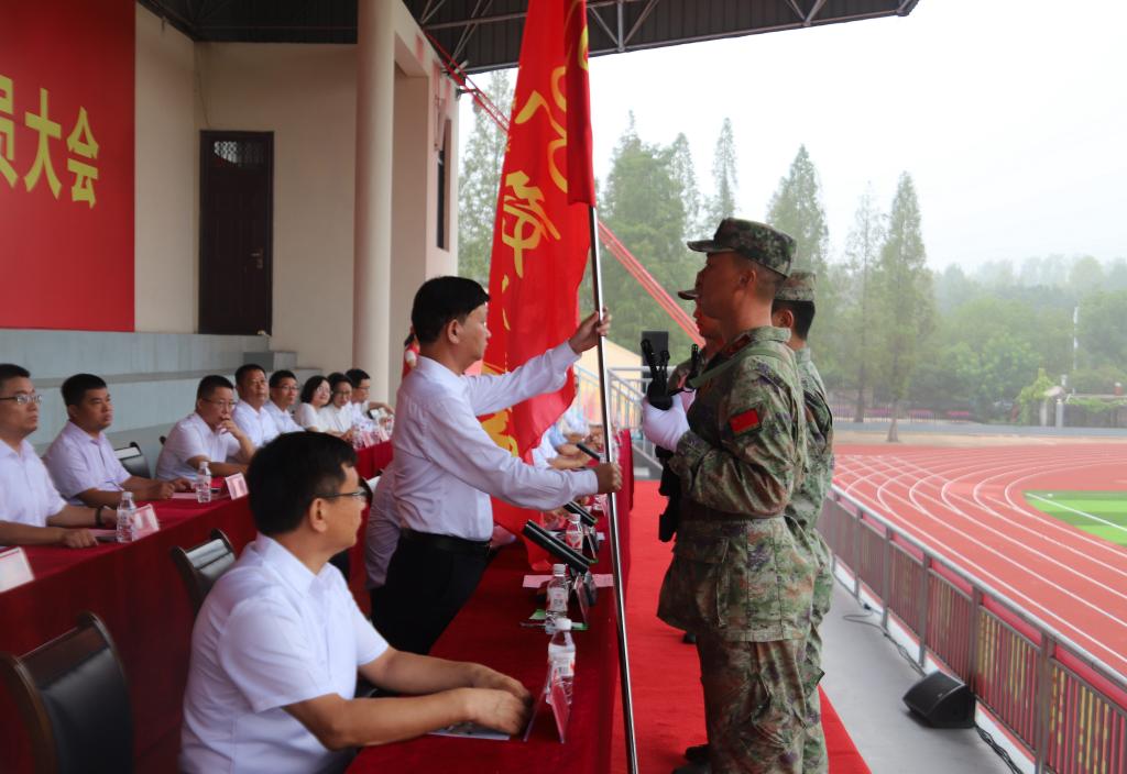 叶长青向军训团授旗,标志着新生军训正式启动。
