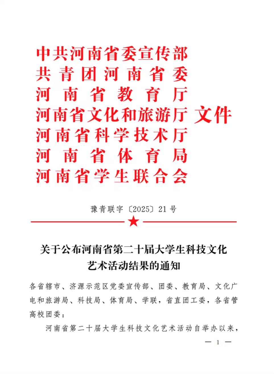 近日,由中共河南省委宣传部、共青团河南省委、河南省教育厅、河南省文化和旅游厅、河南省科学技术厅、河南省体育局、河南省学生联合会联合主办的河南省第二十届大学生科技文化艺术活动各奖项结果揭晓,我院在舞蹈、书法、绘画、短视频创作及戏剧类等多项比赛中斩获佳绩,充分展现了我院艺术教育的丰硕成果与青年学子昂扬向上的精神风貌。
