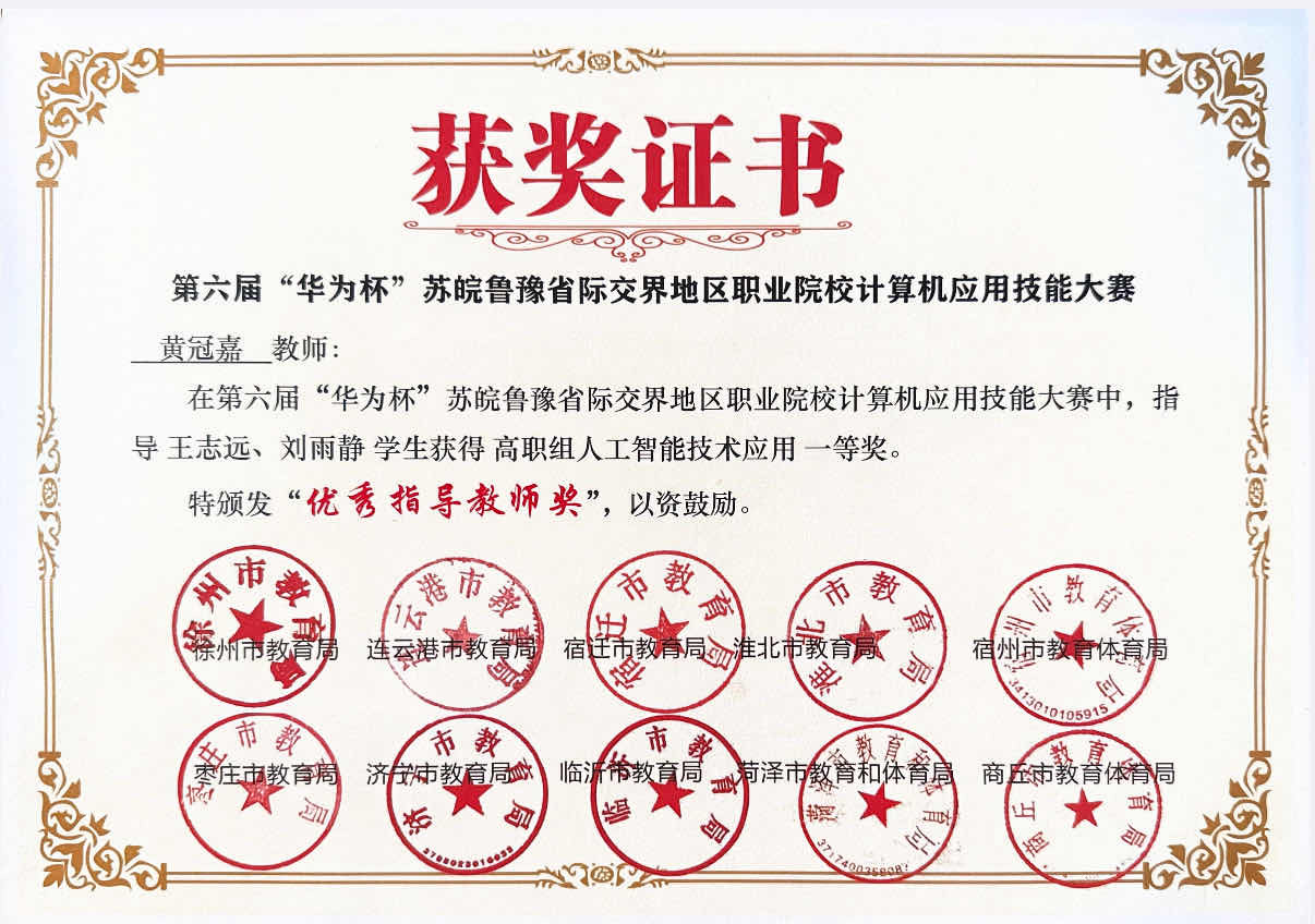 近日,第六届“华为杯”苏皖鲁豫省际交界地区职业院校计算机应用技能大赛在江苏建筑职业技术学院圆满落幕,我院电子信息工程系选派的五支代表队尽数获奖。其中,由黄冠嘉、田丞佑两位老师指导的学生王志远、刘雨静在“人工智能技术应用”赛项中荣获一等奖,刷新了我院在该项赛事中的历史最好成绩。