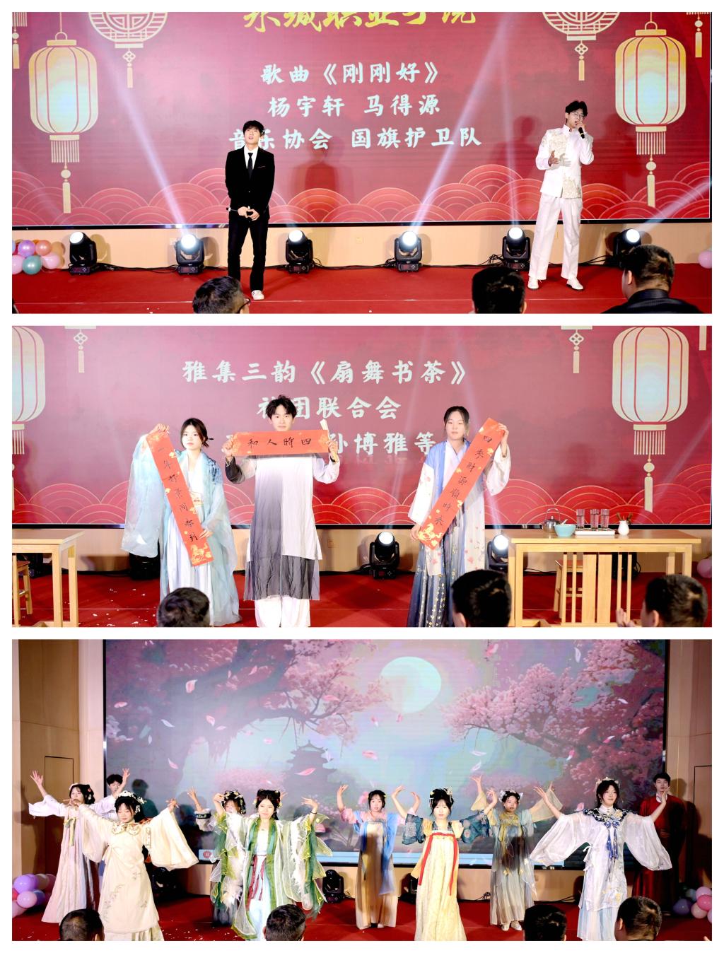 晚会现场灯火璀璨、气氛热烈,各类节目精彩纷呈、亮点频出。民族舞《葡萄藤下的欢歌之舞》展现文化根脉,舞蹈《相和歌》以汉代乐舞为原型重现千年雅韵;朗诵《信仰如果有颜色》抒发青年赤诚,小品《“紧”防诈骗》以诙谐剧情还原刷单、网贷等校园高发骗局,引发全场共鸣;《华裳绮梦 汉服韵舞》彰显传统服饰魅力,雅集三韵《扇舞书茶》演绎文人雅趣;爵士舞《舞动青春》跃动创新节拍,歌曲《越来越好》《飞云之下》《刚刚好》《朋友别哭》及手语表演《相亲相爱一家人》不断将现场氛围推向高潮,赢得观众阵阵掌声。