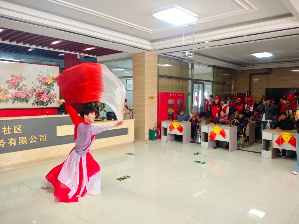 活动现场暖意融融、氛围热烈,志愿者们各展所长、倾情献艺,整场演出欢声笑语、温情满溢。舞蹈协会带来《声声慢》《光亮》两支舞蹈,舞姿轻盈翩跹、柔美动人;汉文化协会展演《半盏风雅 一袖云华》,古韵流转、尽显传统国风雅致;话剧协会奉上反诈小品《天上不会掉馅饼》,将防骗知识巧妙融入剧情,通俗易懂,引得在场老人会心欢笑、受益匪浅;朗诵协会以《致长辈岁月如歌》深情诵读,礼赞长辈一生耕耘与无私奉献;手语协会演绎《灯火里的中国》,以无声手势传递温暖,抒发浓浓家国情怀。“你们演得真好,看得我们心里头热乎乎的!”一位白发老人握着志愿者的手连连称赞。